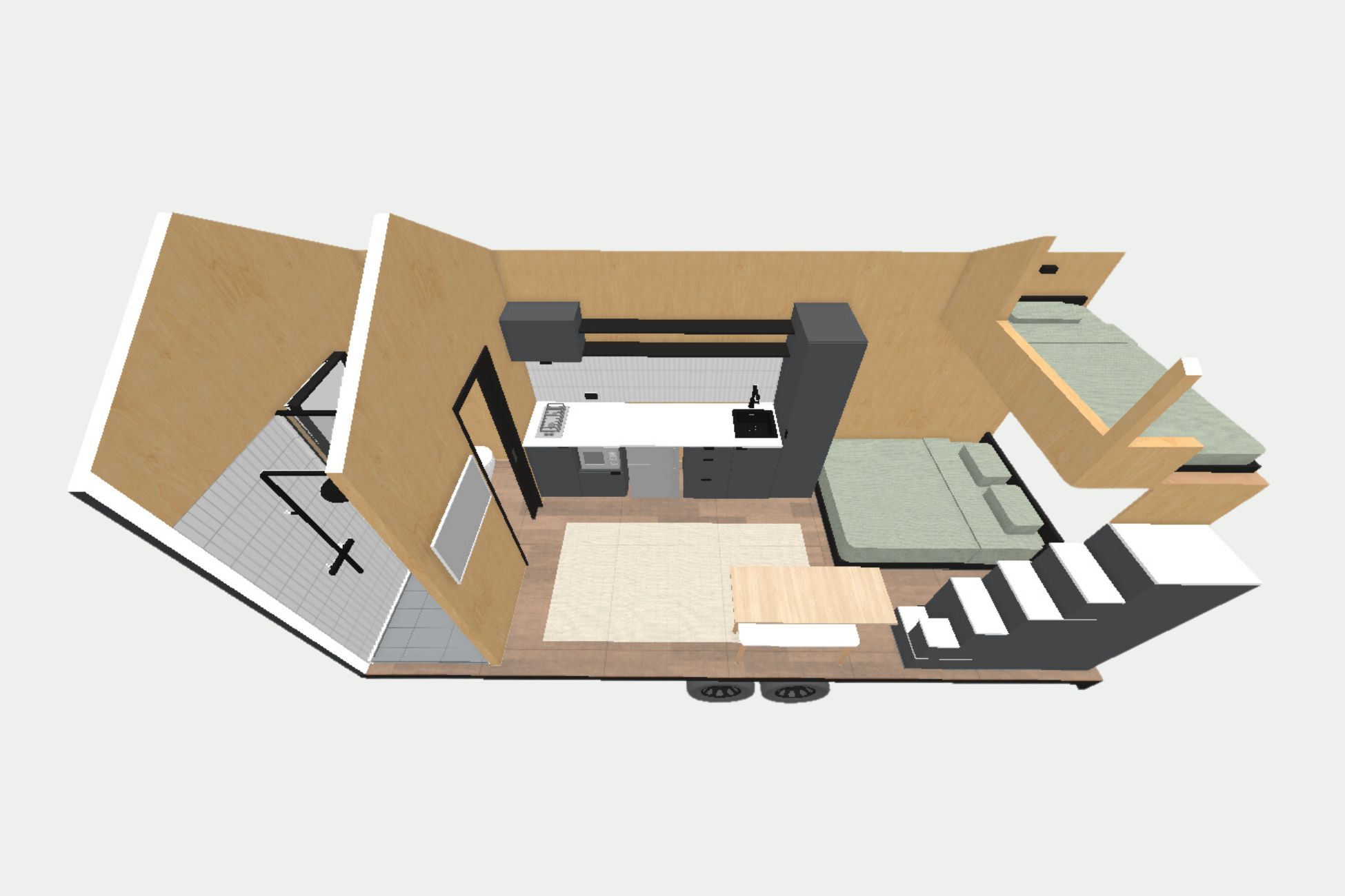 A unique 6m design combining a ground-floor bedroom with an additional loft space. Perfect for guests, work-from-home setups, or extra storage, this layout adapts to your needs while maintaining a cozy, functional living area and a premium kitchen.